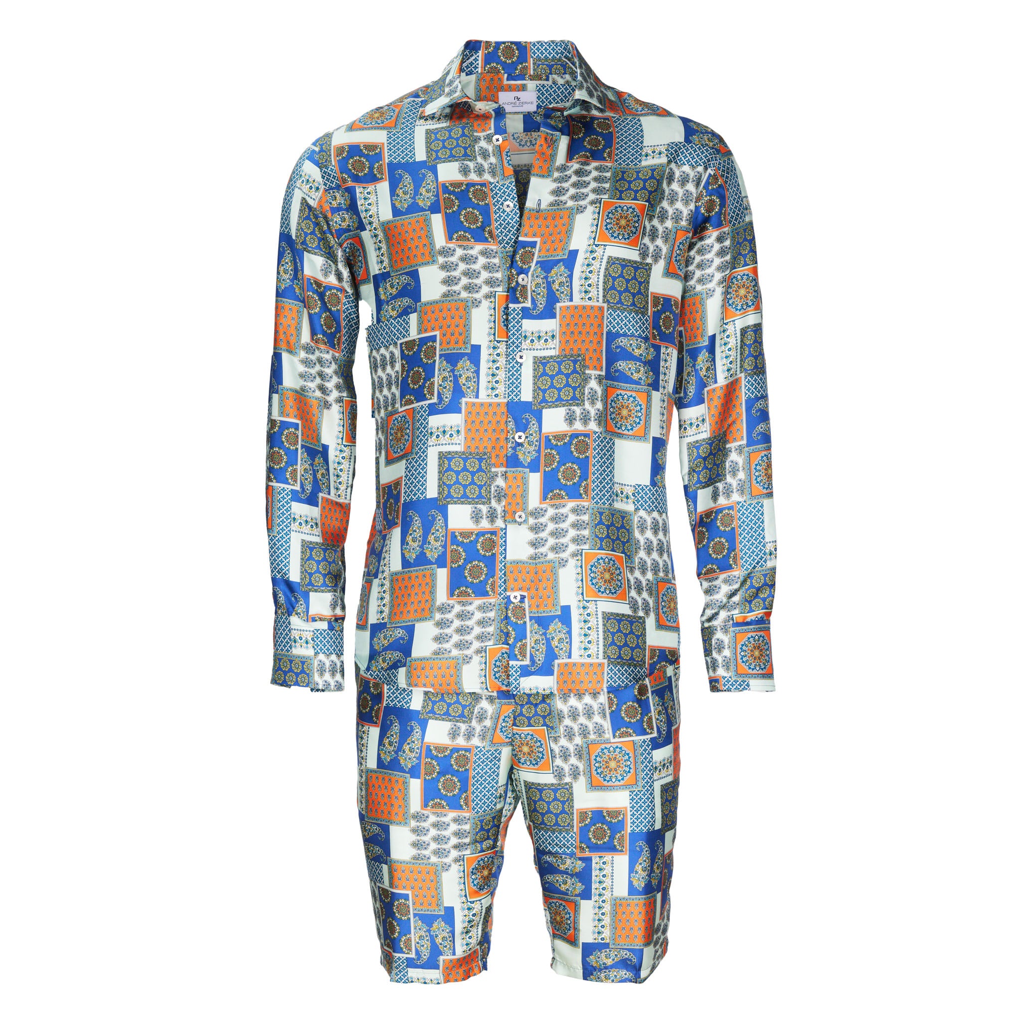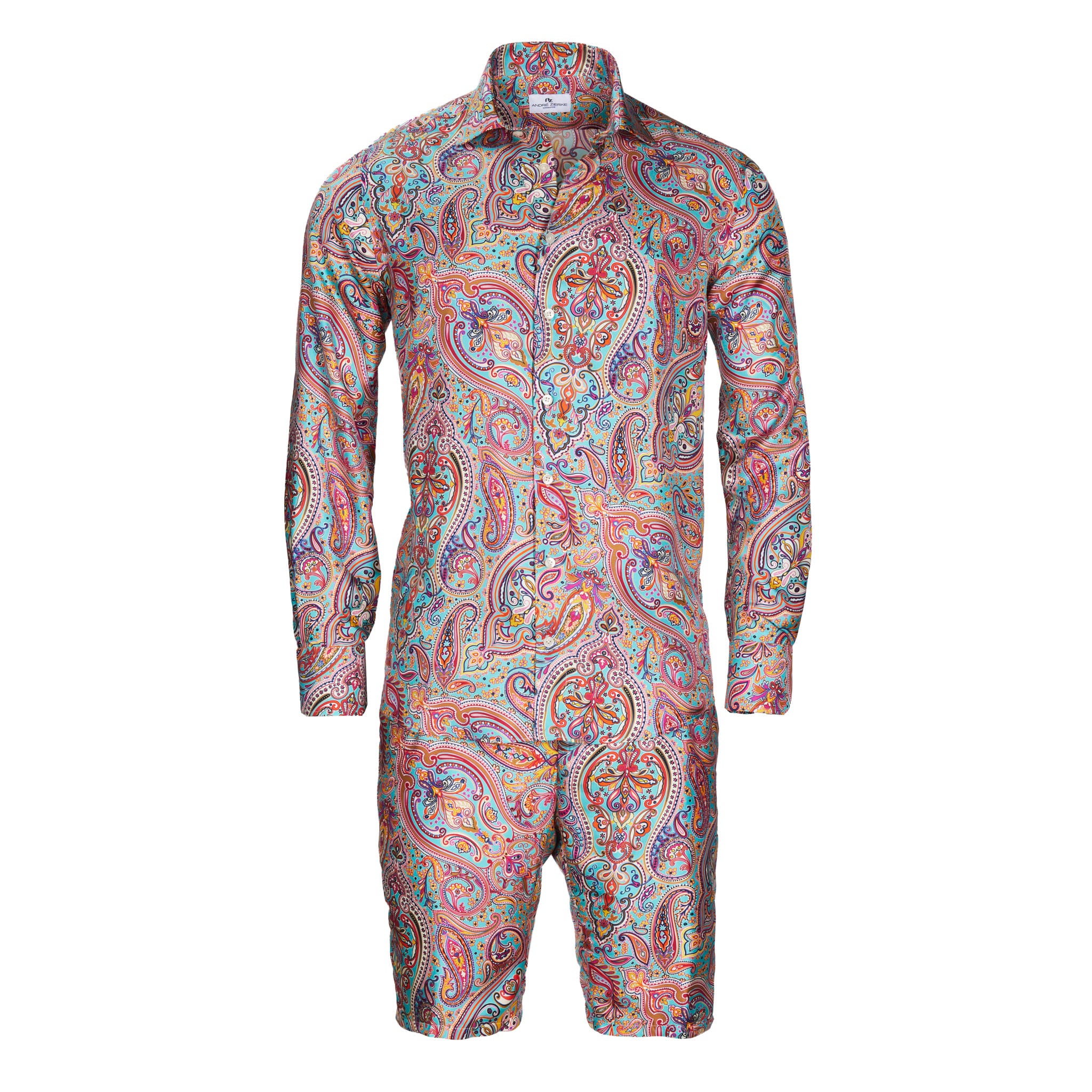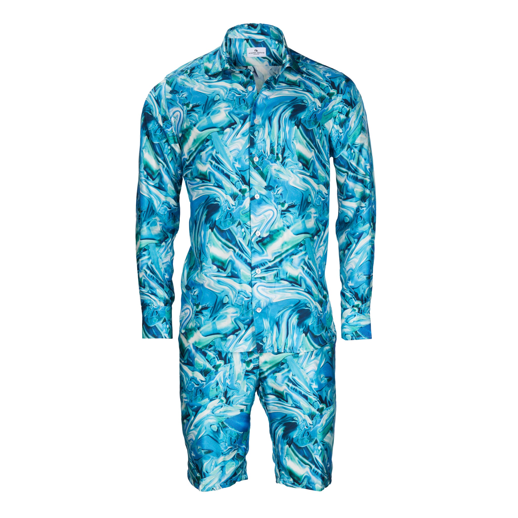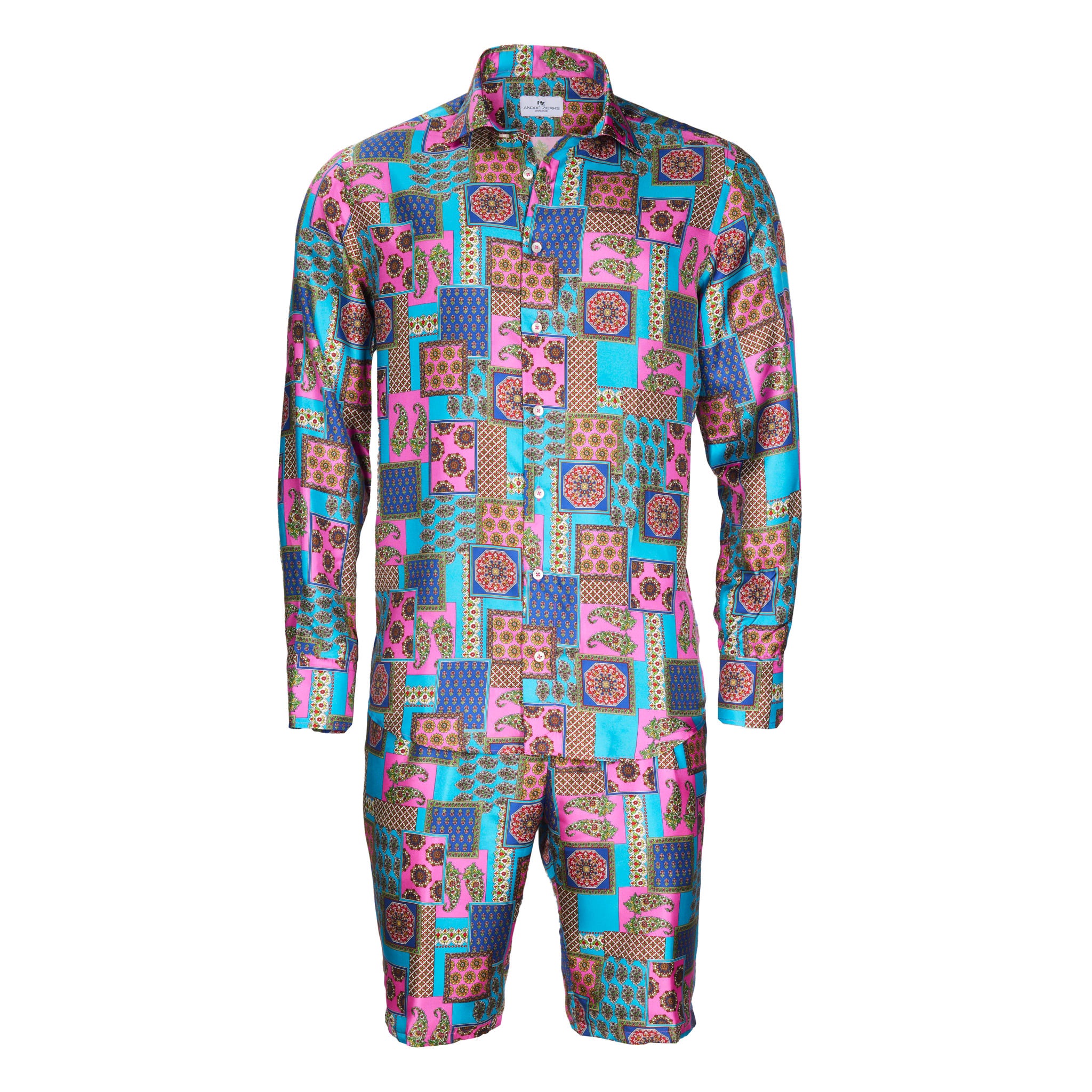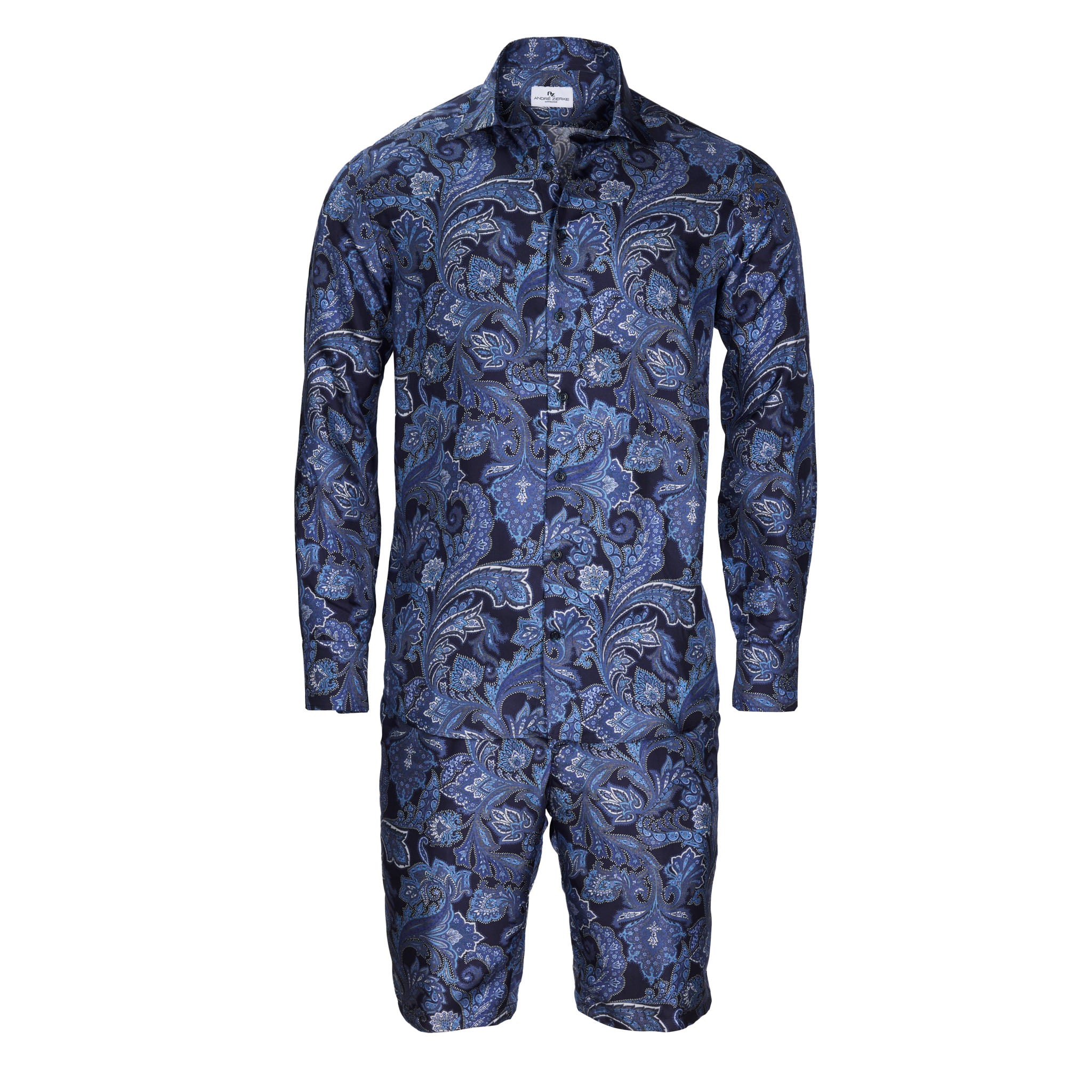 Elégante chemise en soie superfine avec un empiècement doux au col et aux poignets. Elle s'accompagne du bermuda assorti, arrivant au genou, pour les chaudes journées d'été et les nuits en ensemble. La soie 100% est extrêmement douce et légère, donc sensationnelle à porter sur la peau. Les couleurs sont intenses et éclatantes. La fine brillance, la patte de boutonnage lisse, les hauts boutons en nacre et les fines coutures soulignent le goût choisi de celui qui le porte.