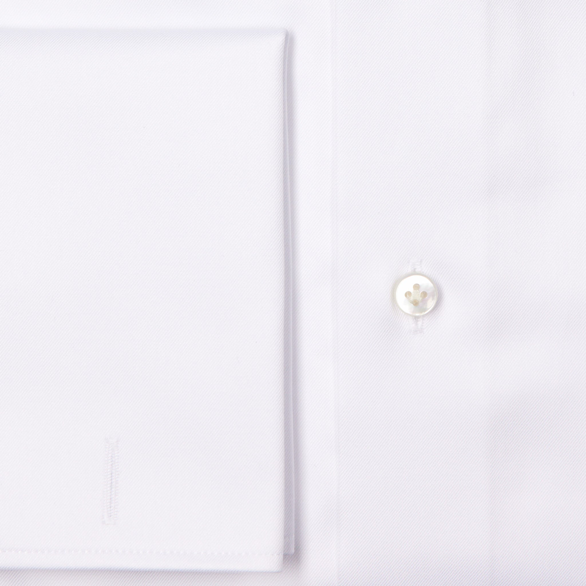 Chemise d'affaires blanche, satinée et élégante avec un col haut de quatre centimètres et des poignets à revers. Le fil 100% coton pleine fleur fait paraître la couleur plus intense & plus éclatante. La brillance fine, la patte de boutonnage lisse, les boutons hauts en nacre et les coutures fines soulignent le goût choisi du porteur. Les empiècements de qualité supérieure dans le col et les poignets permettent à ces derniers de rester en place, même ouverts. La chemise blanche dans cette forme - le basique de toute garde-robe masculine.