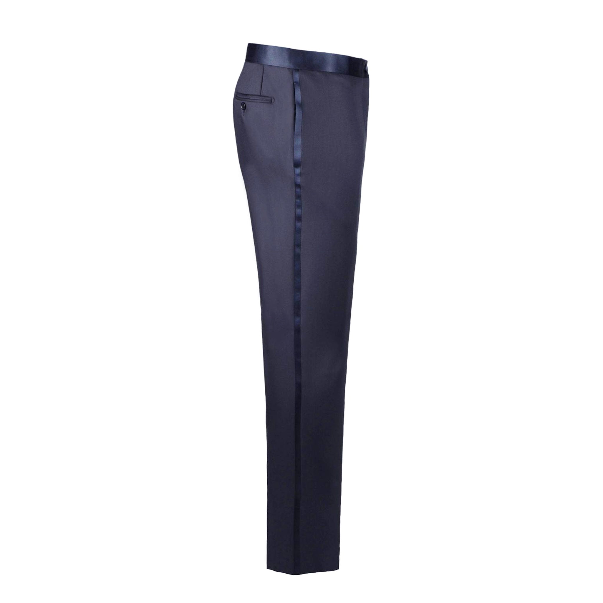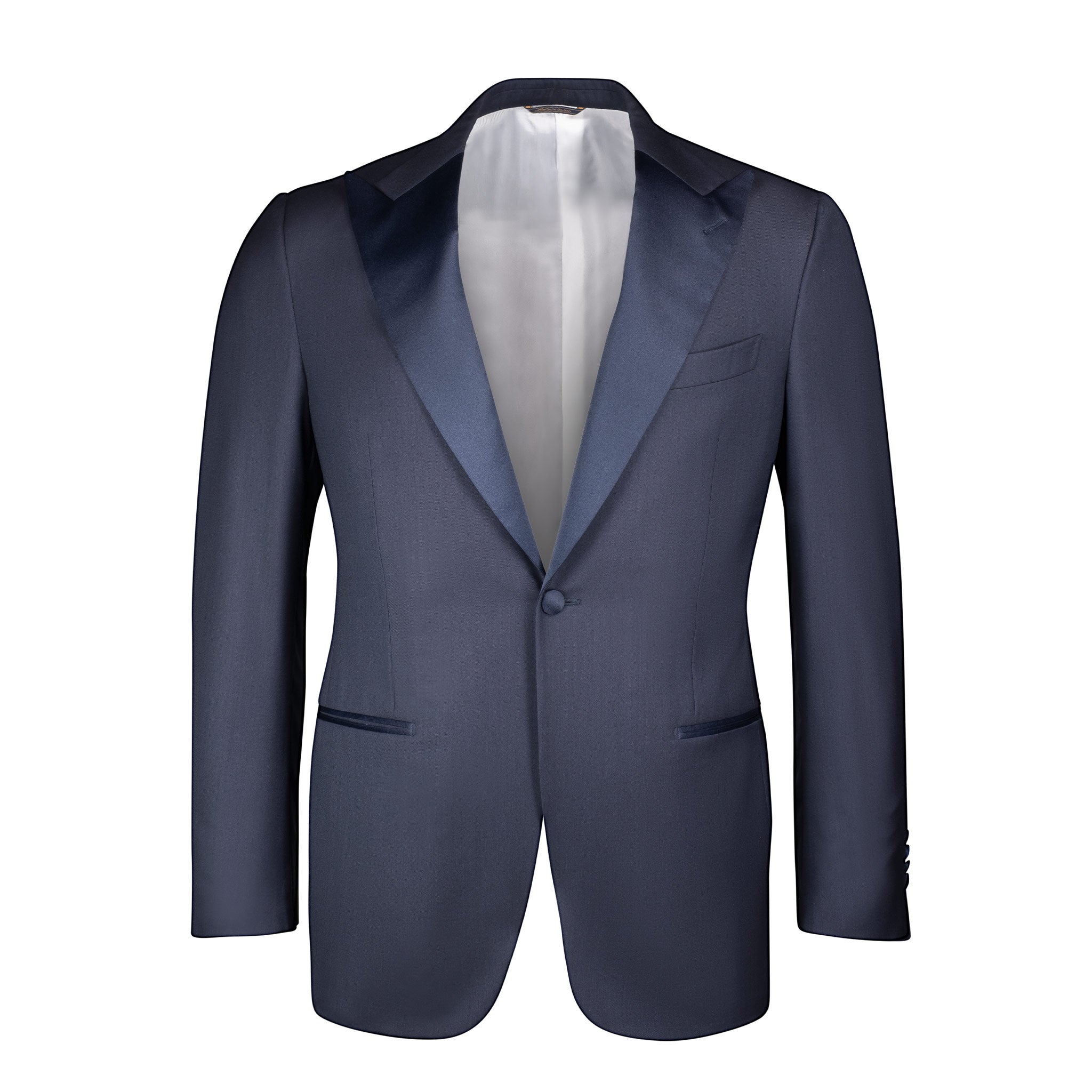 Smoking fin Super 150 à un bouton, sans gilet. Costume de soirée bleu nuit, garni de soie bleu nuit, avec des incrustations de crin au niveau de la poitrine, des épaulettes souples et des fentes latérales. La fine laine vierge 100% brillante, le large facon en pointe de la veste, les boutons à œillets recouverts de soie, la ceinture du pantalon et les gallons latéraux en satin font de ce smoking un accroche-regard exclusif, sur les red carpet du monde entier - de Cannes à L.A. La laine issue du tissage italien le plus fin est retordue, très fine et sous tension, de sorte que cette qualité de tissu se froisse à peine. Cet extraordinaire vêtement black tie donne l'impression d'être en Bond et ne laisse pas l'homme sur le carreau lors des longues missions nocturnes. 100% made in Italy.