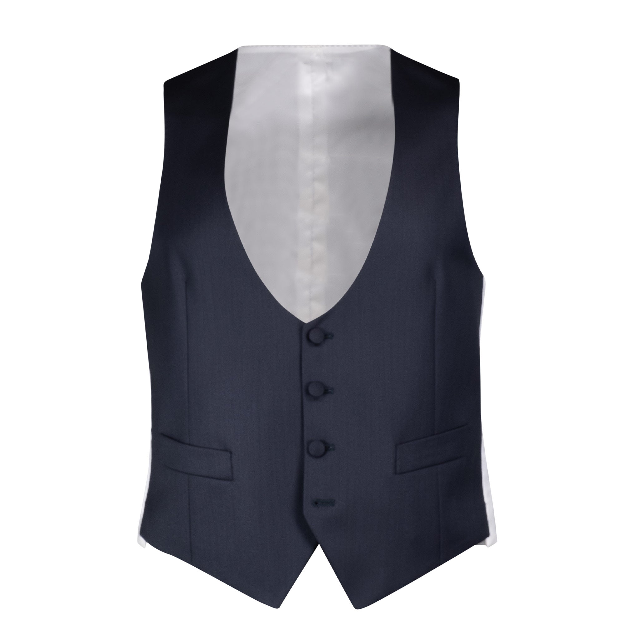 Super 150 smoking fin à un bouton avec gilet. Costume de soirée bleu nuit, garni de soie bleu nuit, avec des incrustations de crin au niveau de la poitrine, des épaulettes souples et des fentes latérales. La fine laine vierge 100% brillante, le large facon en pointe de la veste, les boutons à œillets recouverts de soie, la ceinture du pantalon et les gallons latéraux en satin font de ce smoking un accroche-regard exclusif, sur les red carpet du monde entier - de Cannes à L.A. La laine issue du tissage italien le plus fin est retordue, très fine et sous tension, de sorte que cette qualité de tissu se froisse à peine. Cet extraordinaire vêtement black tie donne l'impression d'être en Bond et ne laisse pas l'homme sur le carreau lors des longues missions nocturnes. 100% made in Italy.